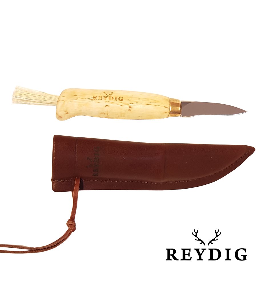 Mushroom knife of the highest quality, which is made in Lapland. Reindeer leather case included.Product informationMaterial: Birch with stainless blade, brush on the shaft endSize: Blade 5cmColor: UntreatedBrand: REYDIG