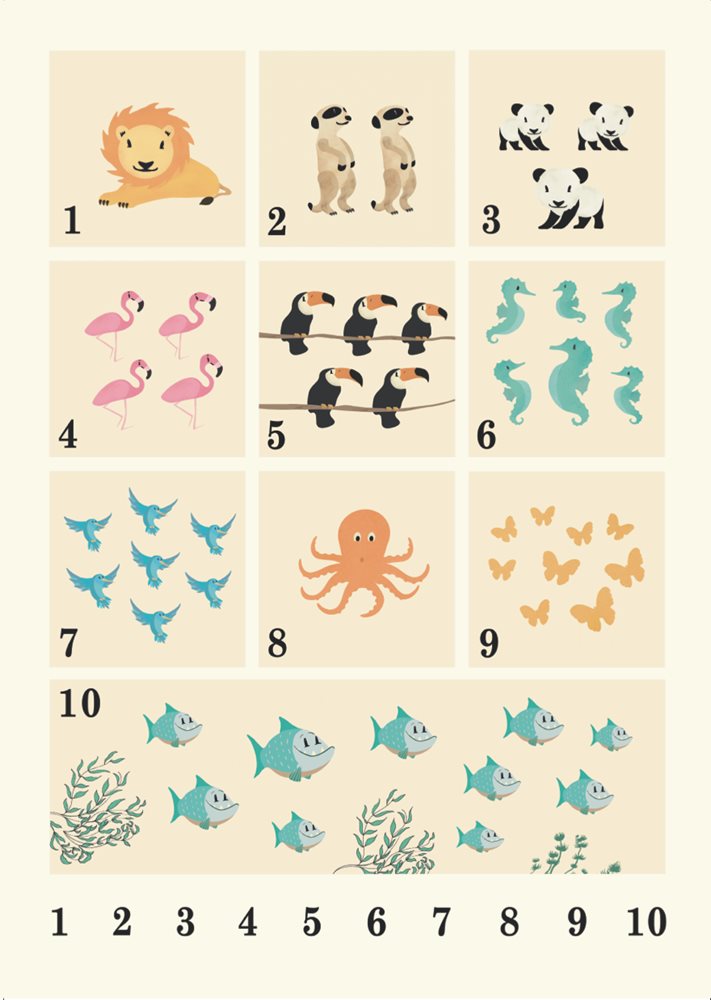 Lär dina barn att räkna med denna fina planch av hög kvalitet! Varje siffra, 1-10, representeras av ett djur i samma antal.ProduktinformationStorlek: 50 x 70 cmVikt: 170 gramMaterial: Svanenmärkt silkpapper