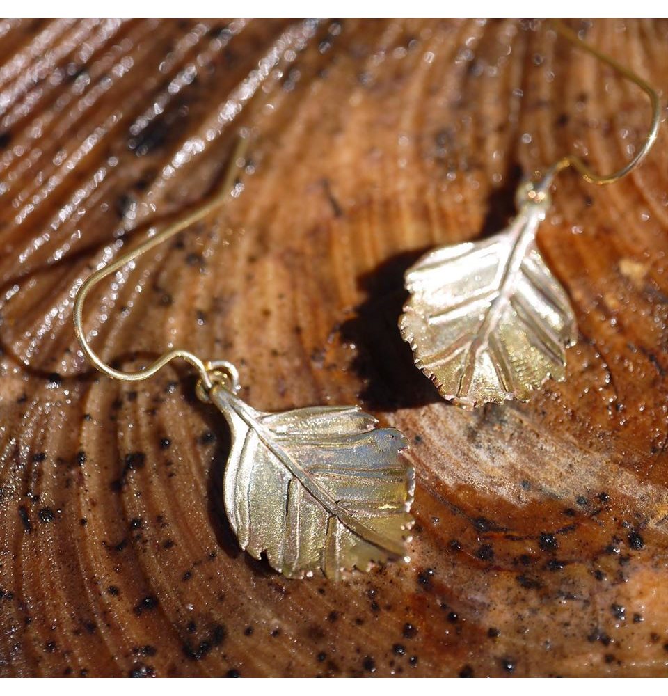 Vackra örhängen utformade som björklöv. Löven är tillverkade i mässing och kroken i förgyllt silver 925.